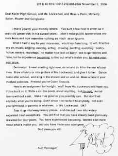 Here's an assignment for tonight, and I hope Ms. Lockwood will flunk you if you don't do it: Write a six line poem, about anything, but rhymed. No fair tennis without a net. Make it as good as you possibly can. But don't tell anybody what you're doing. Don't show it or recite it to anybody, not even your girlfriend or parents or whatever, or Ms. Lockwood. OK?